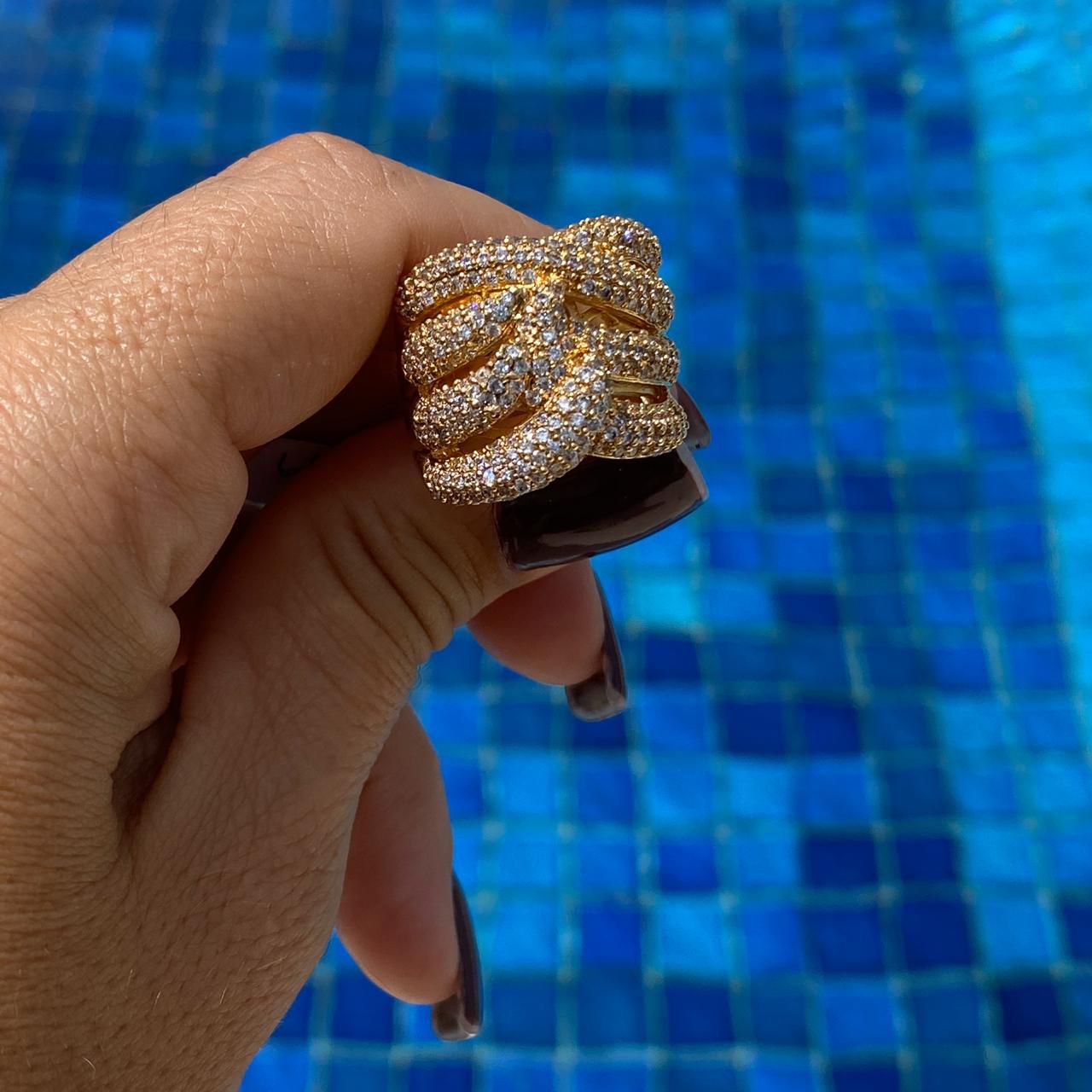 ANEL DOURADO COM TIRAS ENTRELAÇADAS EM ZIRCONIAS BRANCAS MICRO CRAVEJADAS