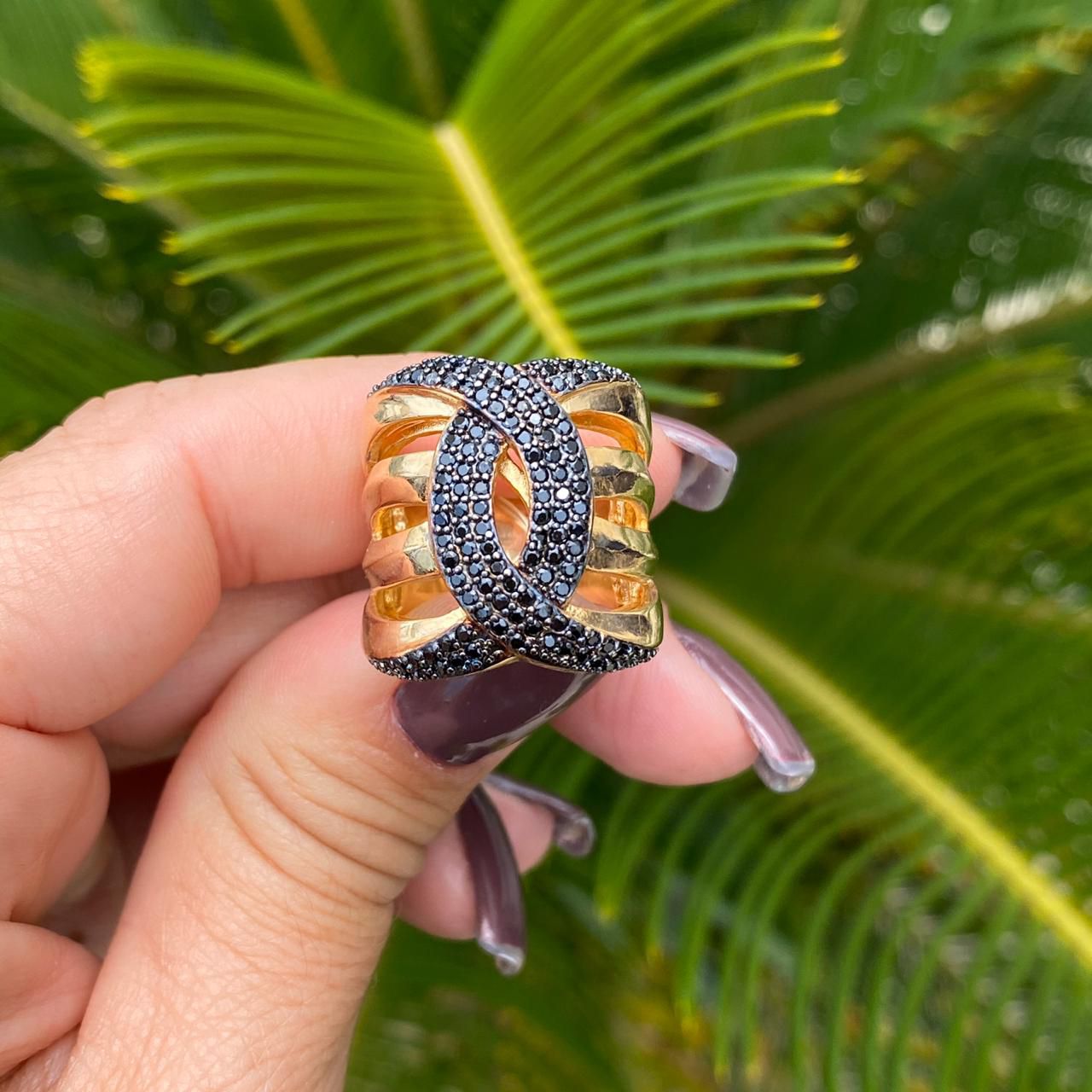 ANEL DOURADO VAZADO EM X com ZIRCÔNIAS NEGRAS