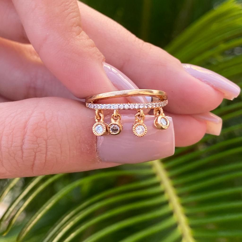 ANEL DUPLO FOLHEADO OURO 18K com ZIRCÔNIAS PENDURADAS