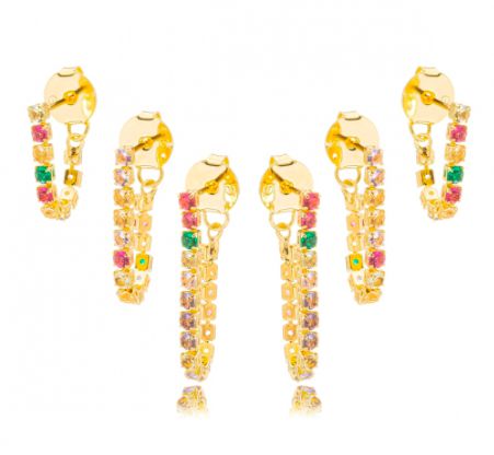 Brinco Banhado ouro 18k Trio Ear Jacket Cristal Color