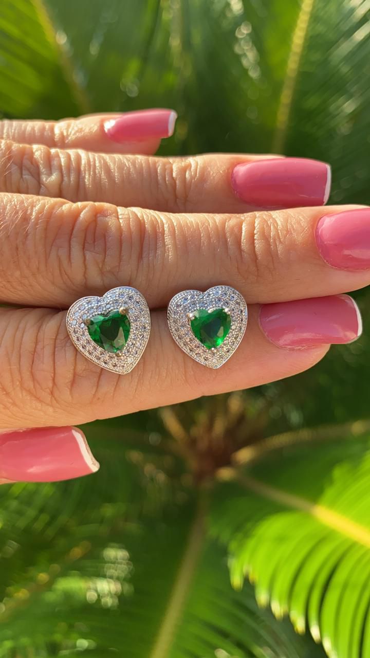 BRINCO FOLHEADO RODIO BRANCO CORAÇÃO EM ZIRCONIA CRAVEJADA E PEDRA VERDE ESMERALDA