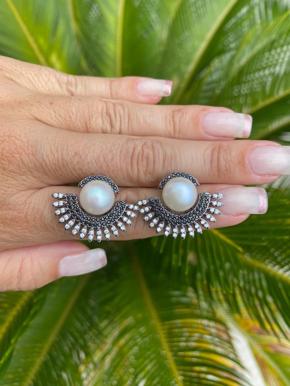 BRINCO FOLHEADO RODIO NEGRO COM PÉROLA E ZIRCONIAS BRANCAS E NEGRAS CRAVEJADAS