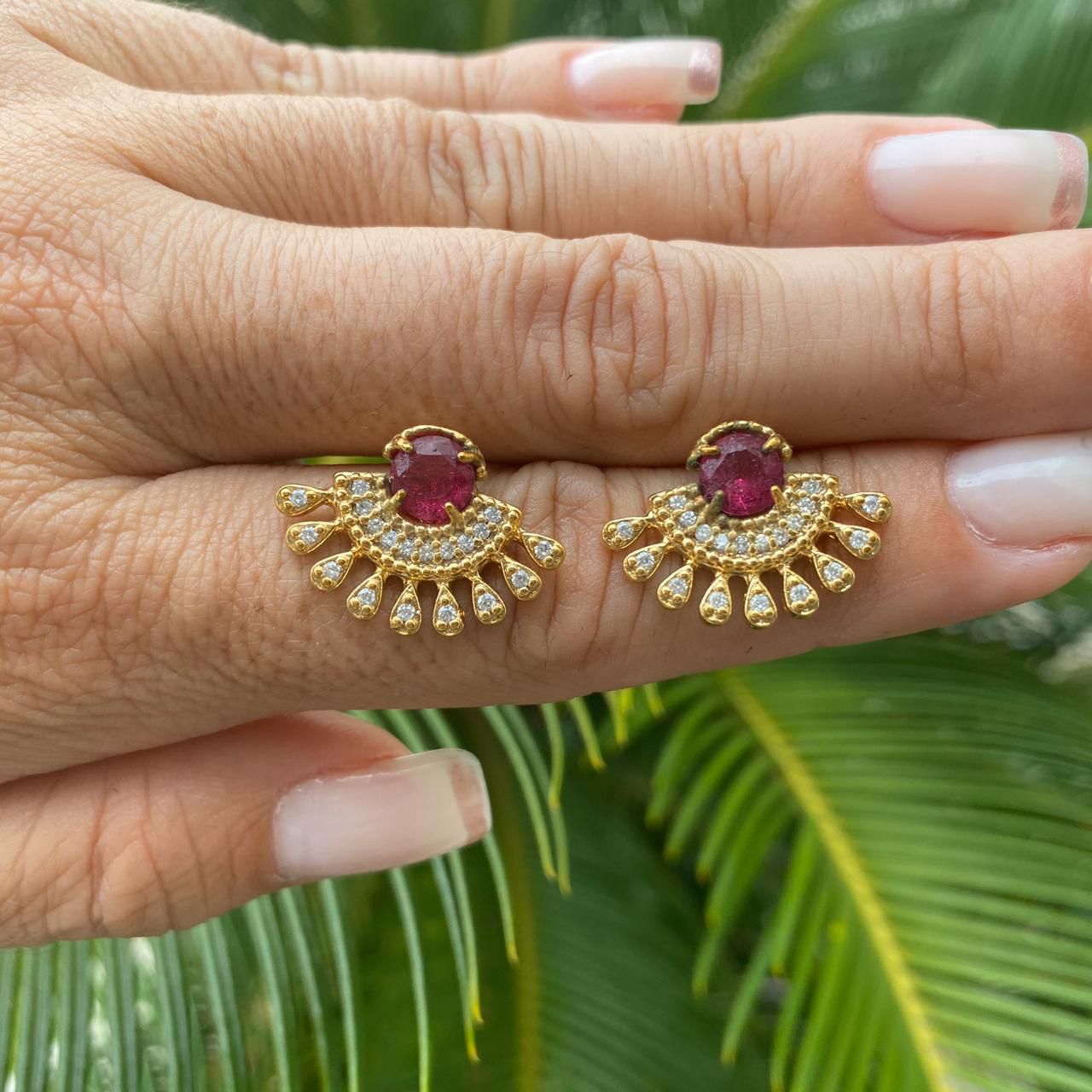 BRINCO FOLHEADO OURO 18K LEQUE COM CRISTAL RUBI COM ZIRCÔNIAS BRANCAS