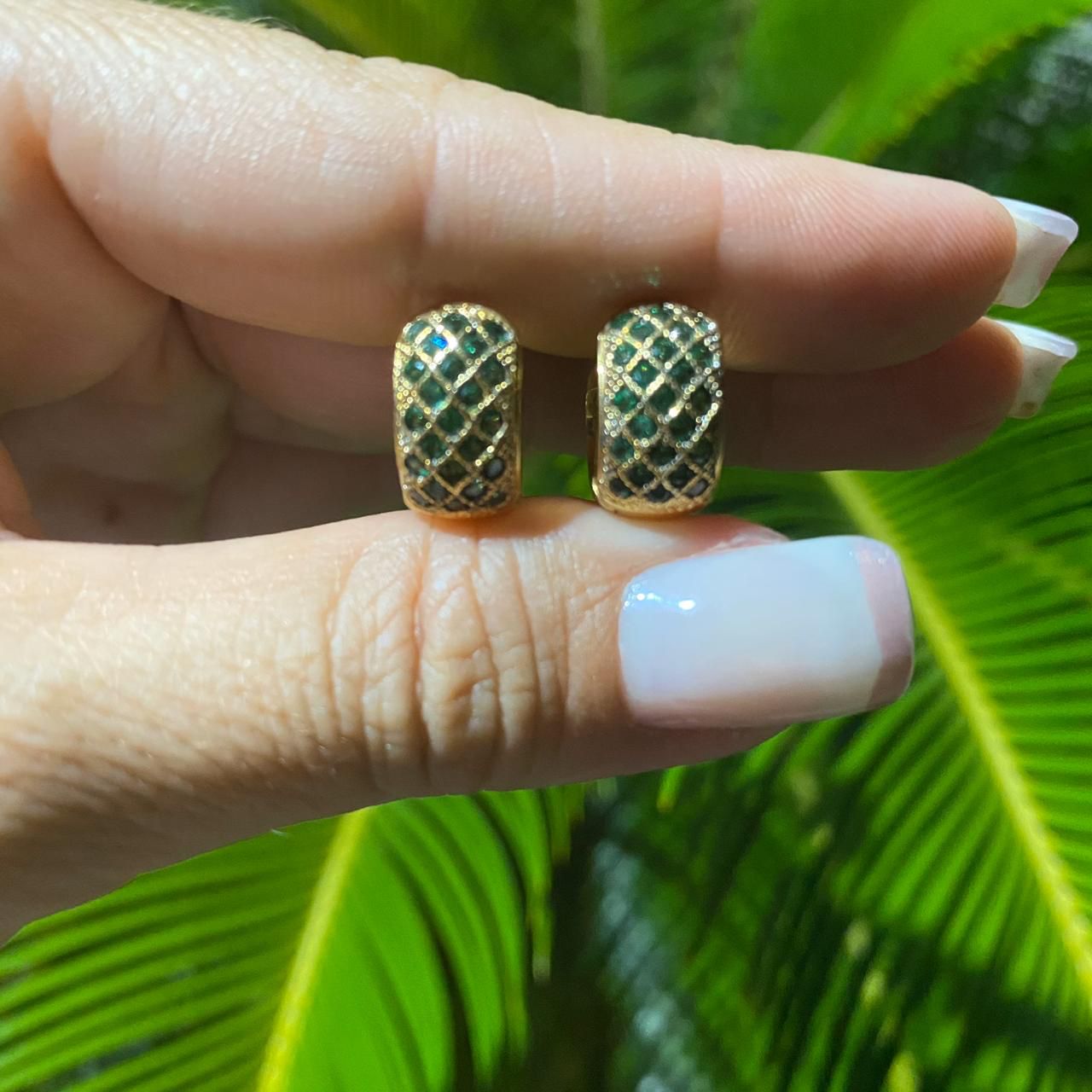 BRINCO FOLHEADO OURO 18K ARGOLA PEQUENA COM ZIRCÔNIAS VERDES