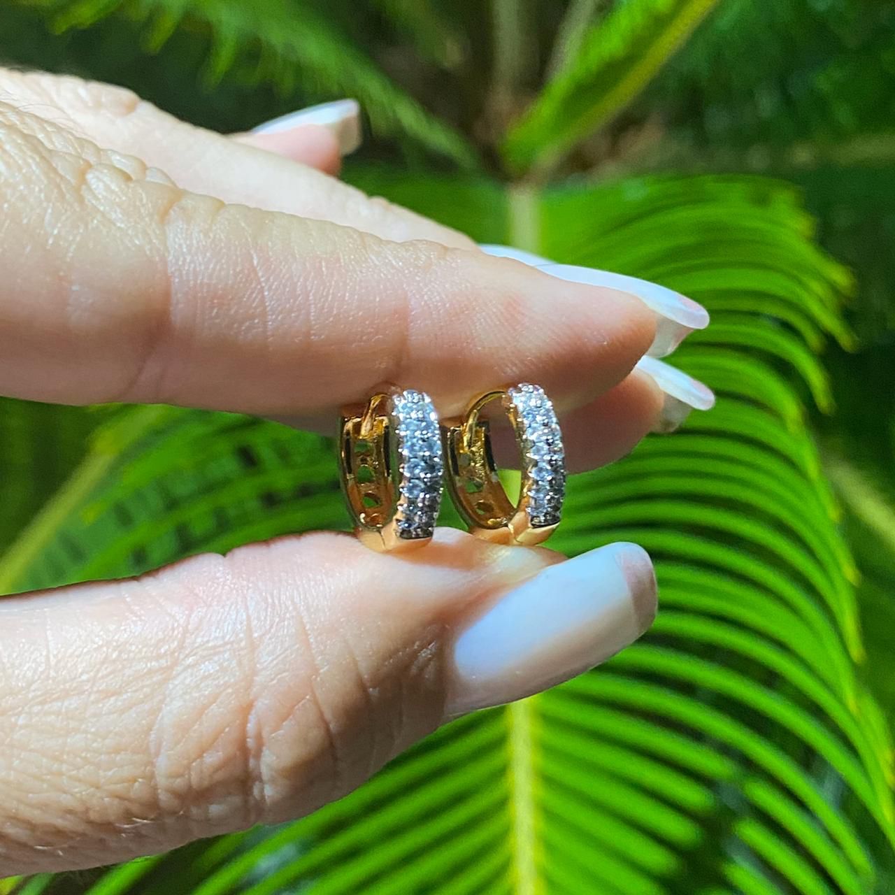 BRINCO FOLHEADO OURO 18K ARGOLA PEQUENA MICRO CRAVEJADA COM ZIRCÔNIA BRANCA E CANETA DE RÓDIO