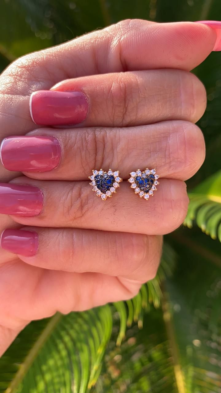 BRINCO FOLHEADO OURO 18K CORAÇÃO PEQUENO NA COR AZUL.
