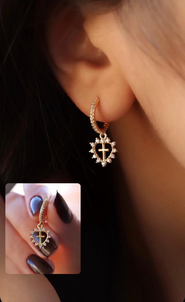 BRINCO FOLHEADO OURO 18K CRUZ PENDURADA COM CORAÇÃO