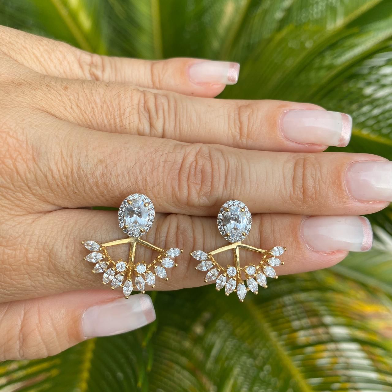 BRINCO FOLHEADO OURO 18K EAR JACKET COM GOTAS DE CRISTAL NAVETE E ZIRCÔNIAS