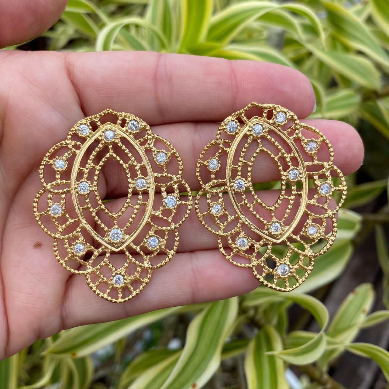 BRINCO FOLHEADO OURO 18K GRANDE VAZADO COM DETALHES EM ZIRCÔNIA
