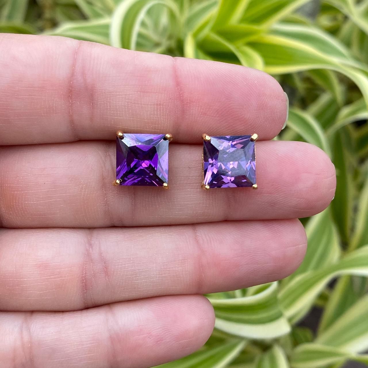 BRINCO FOLHEADO OURO 18K QUADRADO COM CRISTAL LILÁS