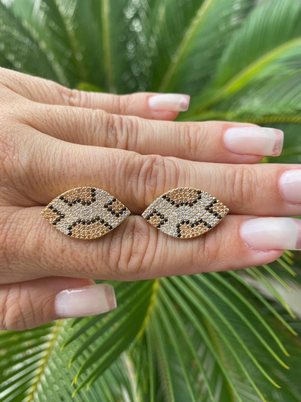 BRINCO FOLHEADO OURO 18K TODO CRAVEJADO EM ZIRCÔNIAS BRANCAS ,NEGRAS E DOURADAS.