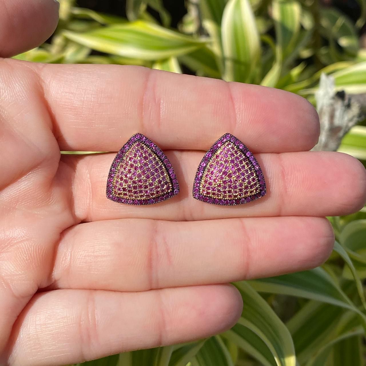 BRINCO FOLHEADO OURO 18K TRIANGULAR TODO CRAVEJADO COM ZIRCÔNIA ROSA