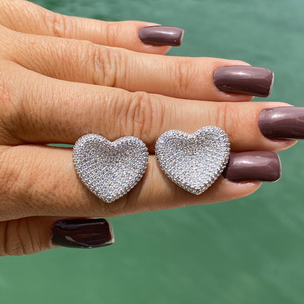 BRINCO FOLHEADO RODIO BRANCO CORAÇÃO CRAVEJADO
