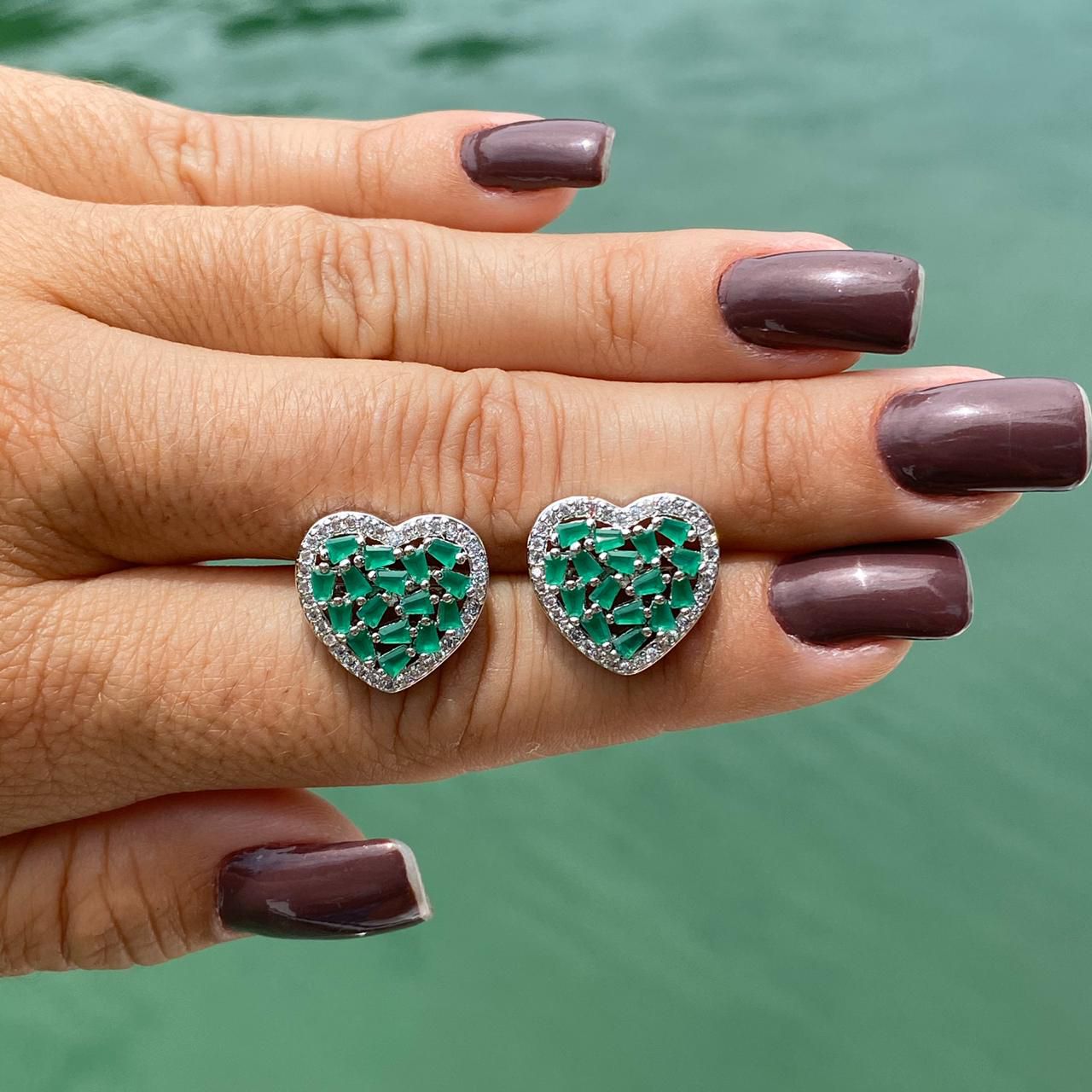 BRINCO FOLHEADO RODIO BRANCO CORAÇÃO TODO CRAVEJADO COM ZIRCÔNIAS BRANCAS E CRISTAL VERDE ESMERALDA