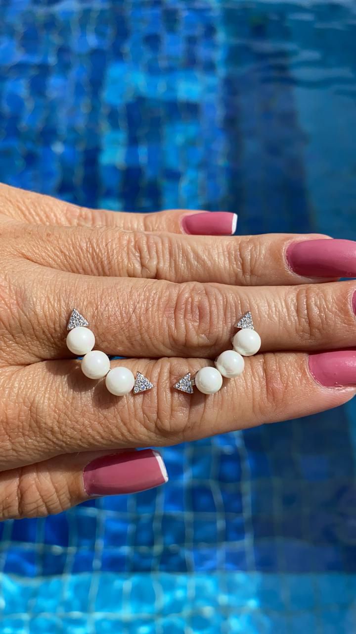 BRINCO FOLHEADO RODIO BRANCO EAR CUFF COM TRÊS PÉROLAS