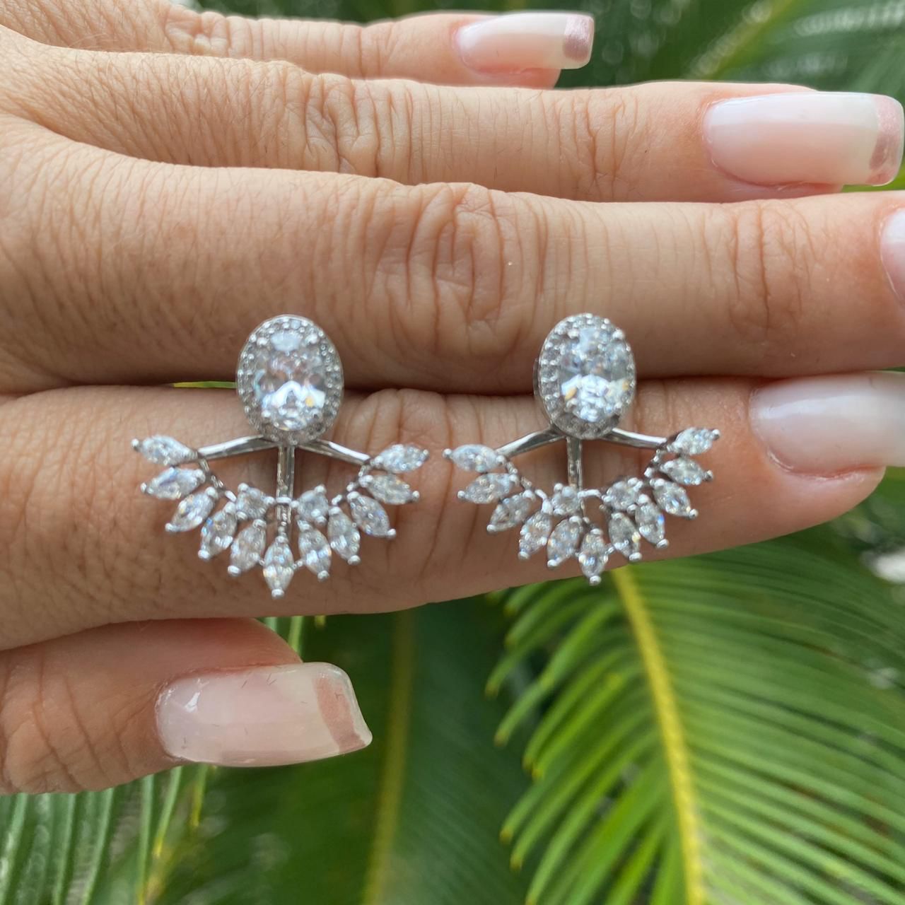 BRINCO FOLHEADO RODIO BRANCO EAR JACKET COM GOTAS DE CRISTAL NAVETE E ZIRCÔNIAS A