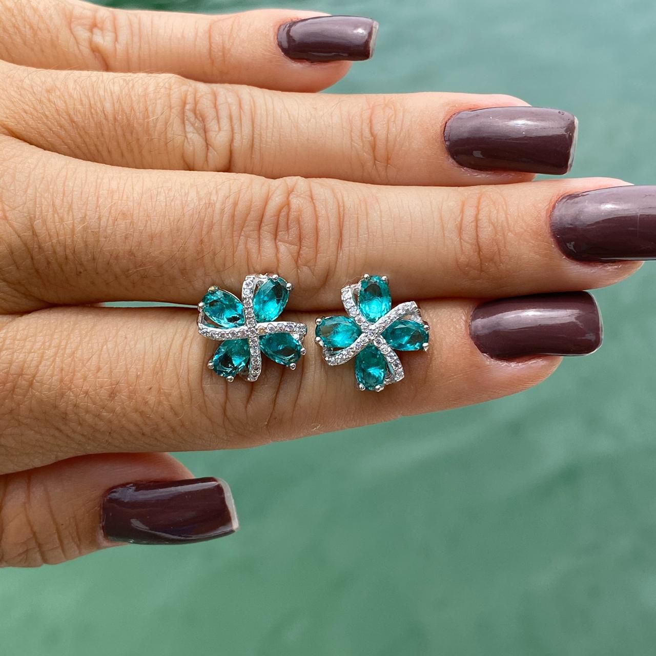 Brinco Folheado Rodio Branco Flor Em Cristal Azul Tiffany E Tiras Cruzadas Em Zircônia