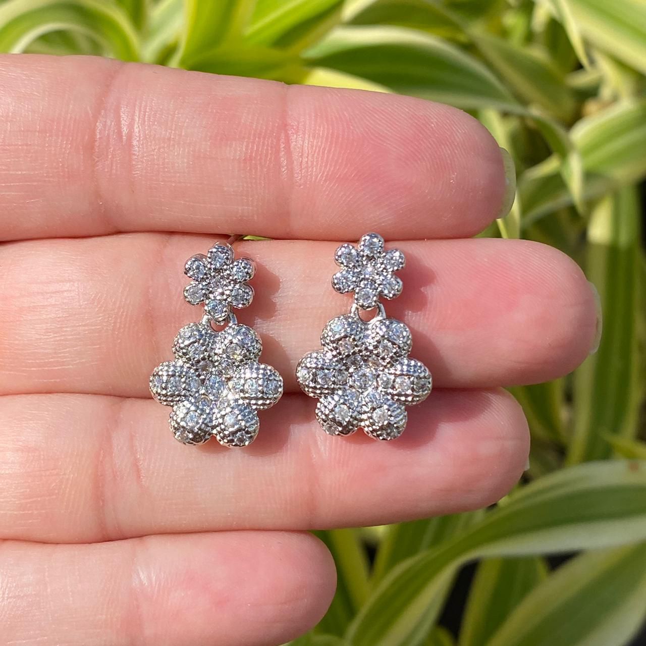 Brinco Folheado Ródio Branco Flores Cravejadas Com Zircônia Branca