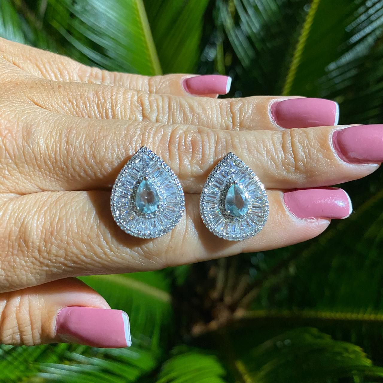 BRINCO FOLHEADO RODIO BRANCO GOTA GRANDE COM CRISTAL E MICRO ZIRCÔNIA CRAVEJADA