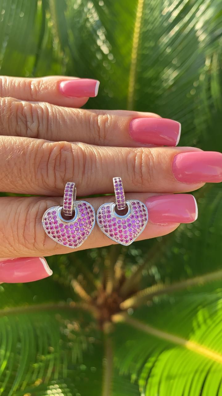 BRINCO FOLHEADO RODIO BRANCO CORAÇÃO COM ZIRCONIA NA COR RUBI.