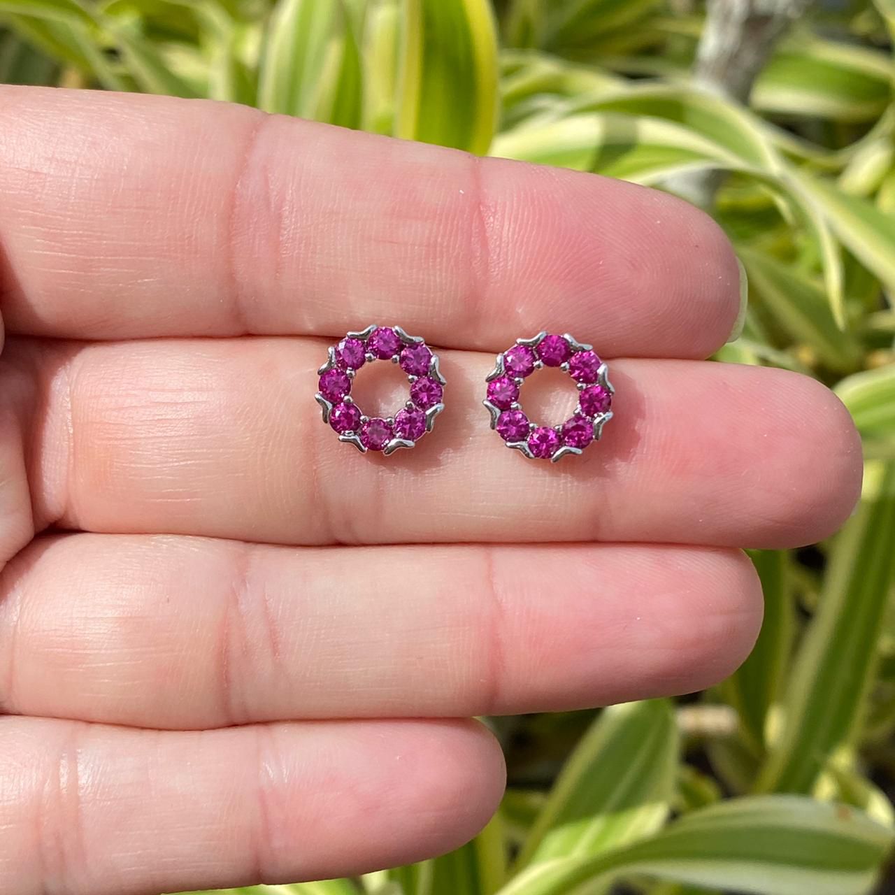 BRINCO FOLHEADO RODIO BRANCO REDONDO COM ZIRCÔNIA ROSA