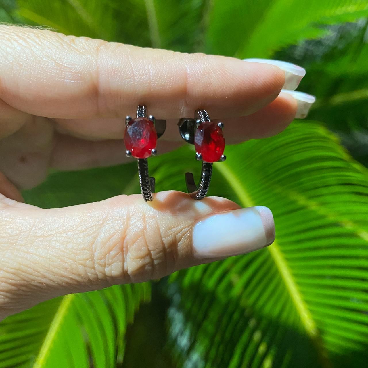 BRINCO FOLHEADO RODIO NEGRO ARGOLA GRANDE CRAVEJADA COM ZIRCONIA NEGRA E PEDRA DE CRISTAL VERMELHO MARSALA