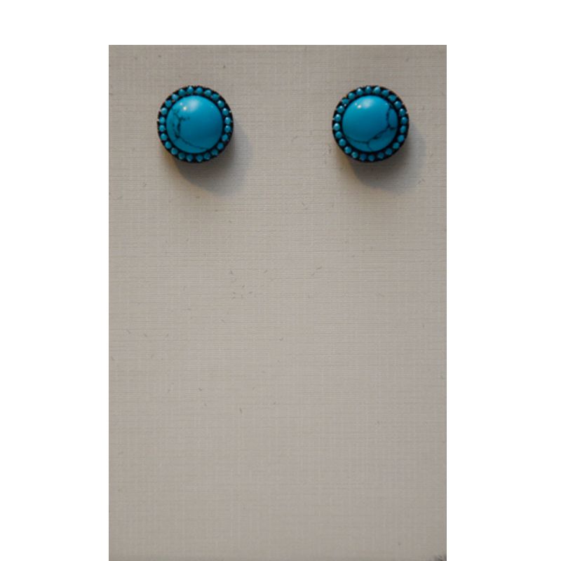 BRINCO FOLHEADO RODIO NEGRO REDONDO COM PEDRA AZUL TURQUESA