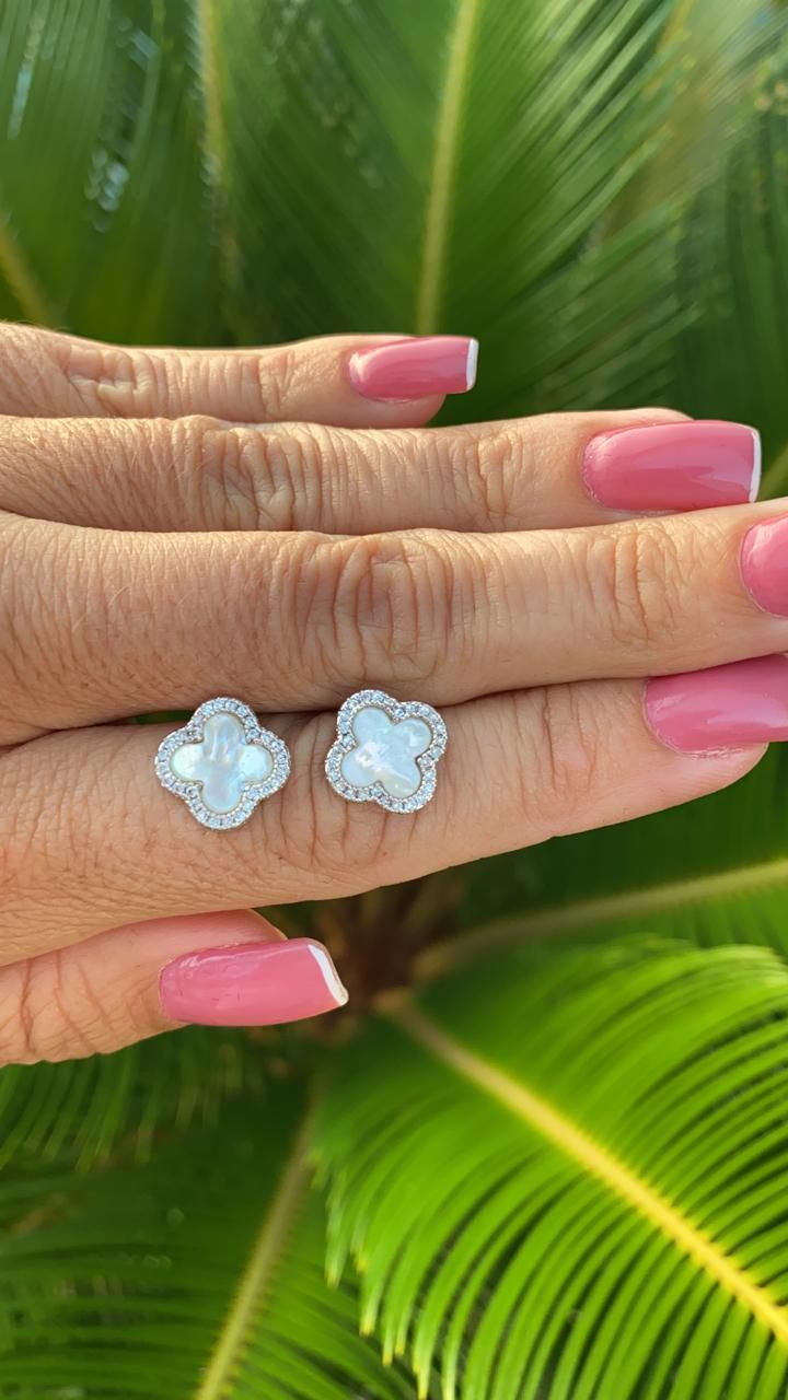 BRINCO FOLHEADO RODIO BRANCO VANCLEEF COM ZIRCÔNIA E MADREPÉROLA