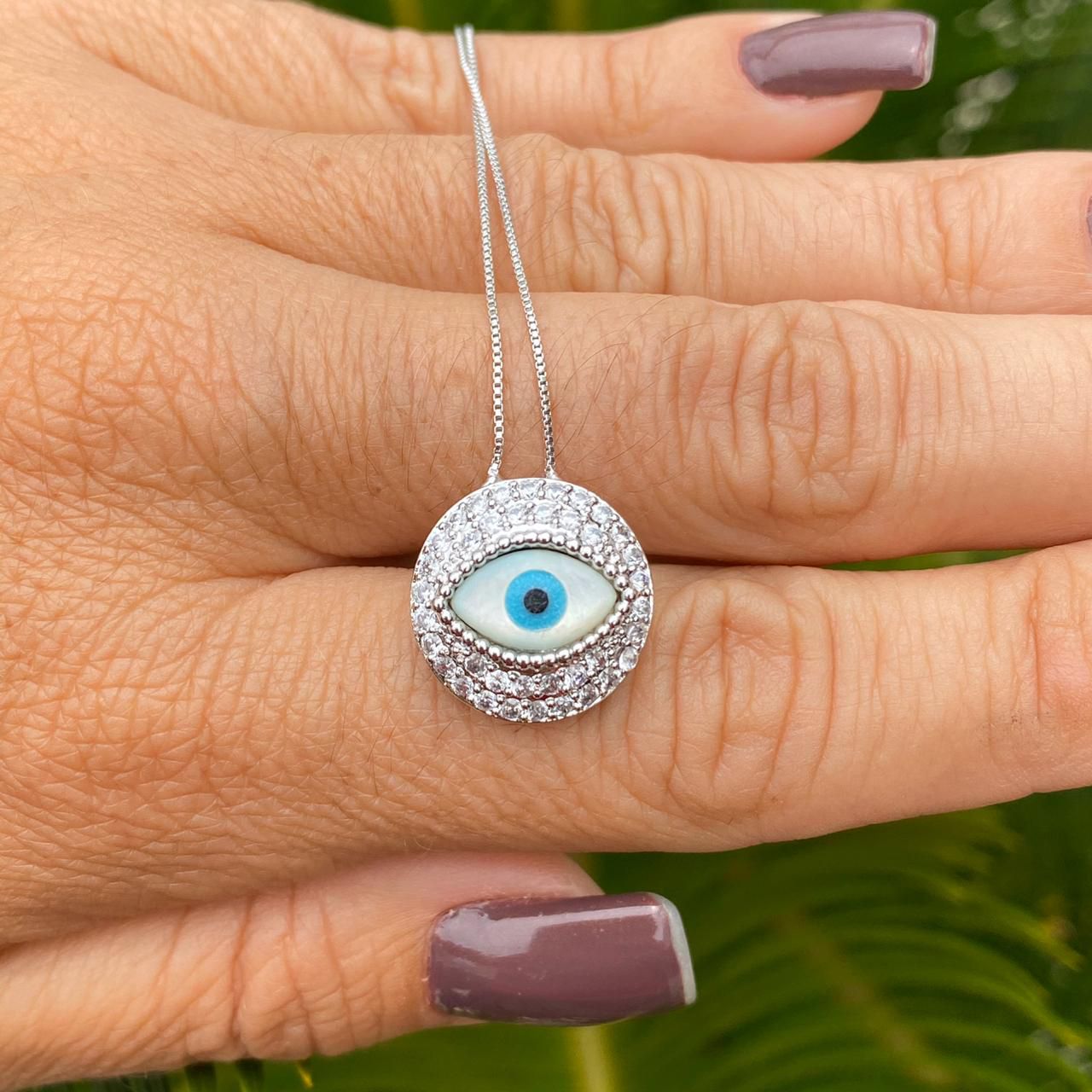 COLAR FOLHEADO RODIO BRANCO OLHO GEGO REDONDO CRAVEJADO
