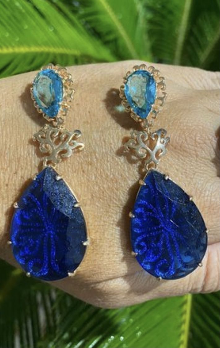 CONJUNTO ANEL E BRINCO FOLHEADO OURO 18K GOTA AZUL