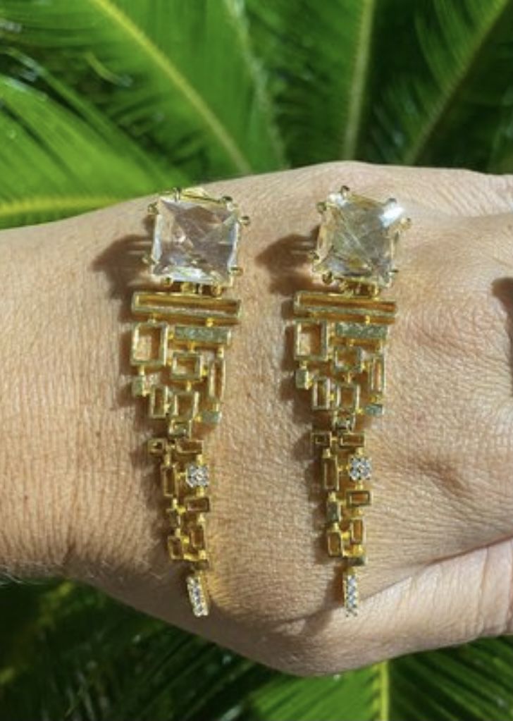 BRINCO FOLHEADO OURO 18K CRISTAL QUADRADO