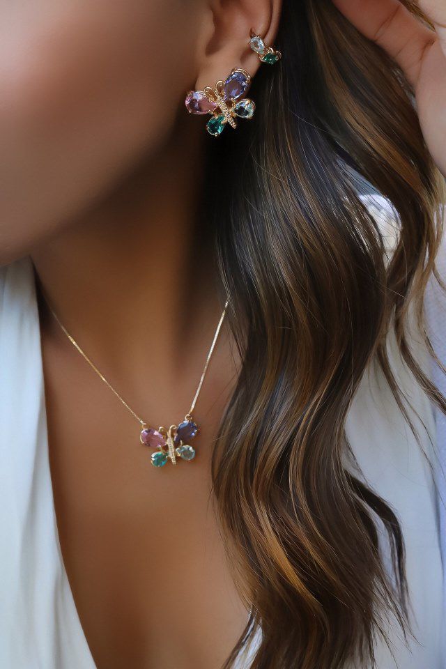 Conjunto Banhado ouro 18k Borboleta Cristal Colorida