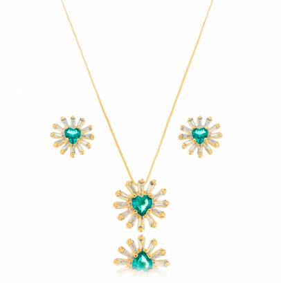 Conjunto Banhado ouro 18k Cristal Verde Coração