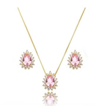 CONJUNTO FOLHEADO OURO 18K GOTA MICRO ZIRCÔNIA CRISTAL ROSA QUARTZO