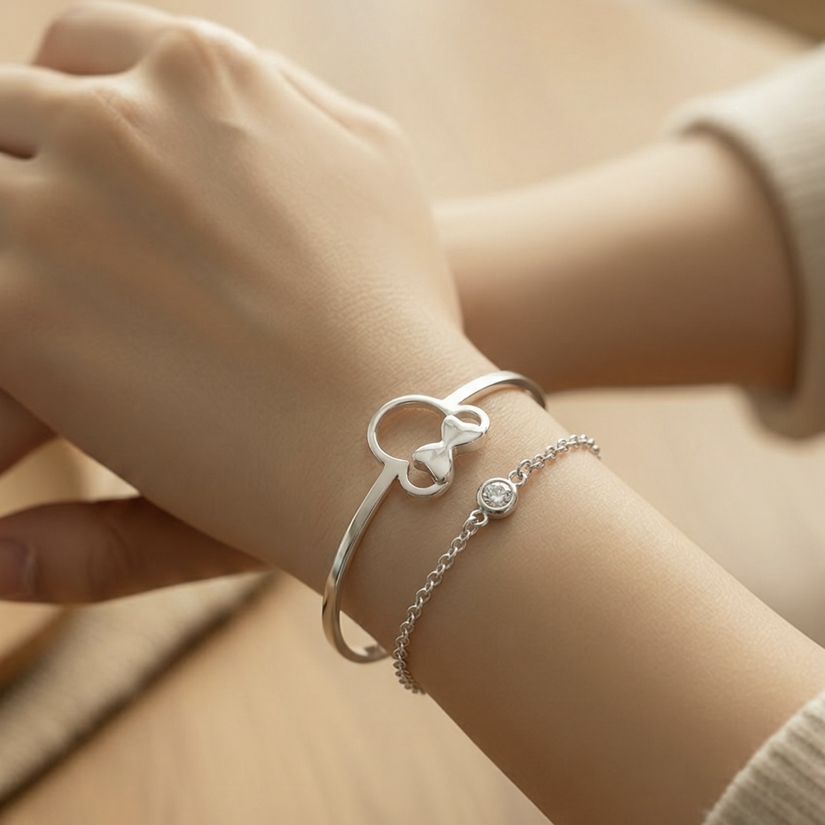PULSEIRA FOLHEDA RODIO BRANCO BRACELETE MINNIE com CORRENTINHA