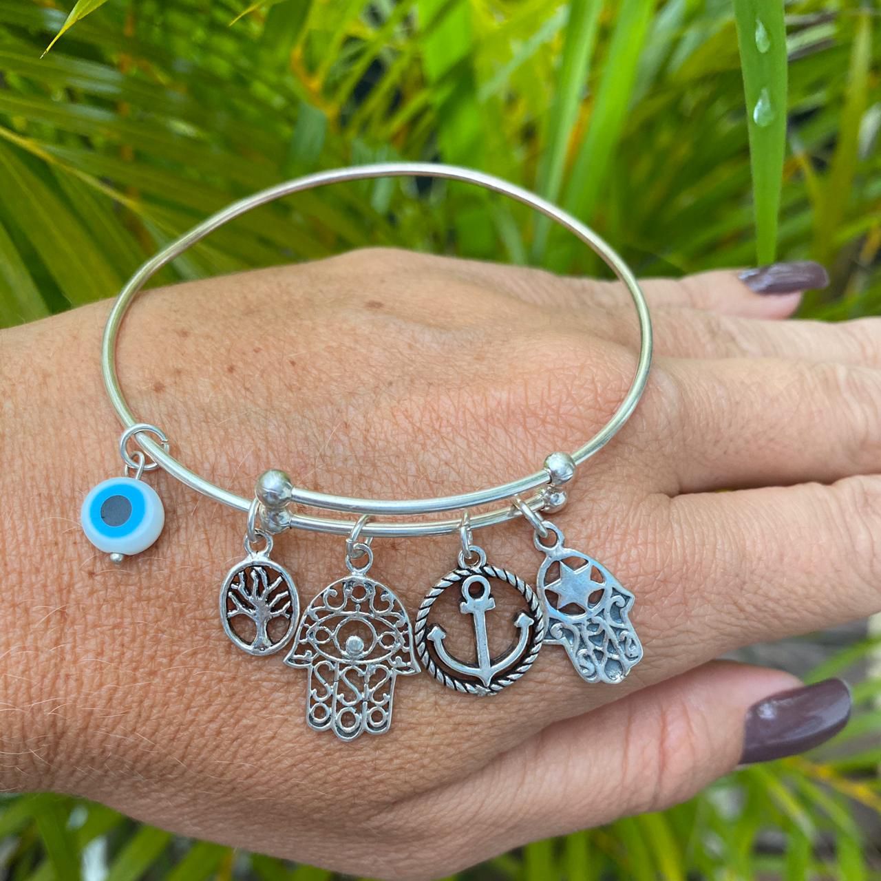 PULSEIRA BRACELETE PRATA 925 COM PINGENTES MÃO DE FÁTIMA, ÂNCORA, MÃO DE FÁTIMA COM ESTRELA, OLHO GREGO E ARVORE DA VIDA